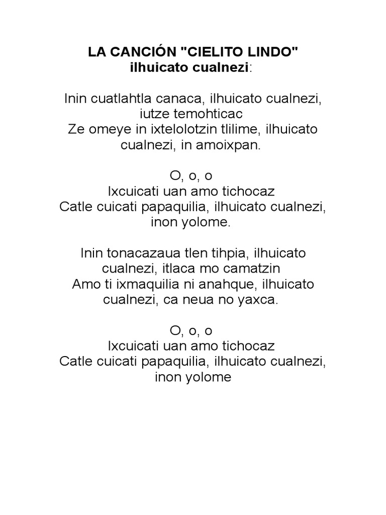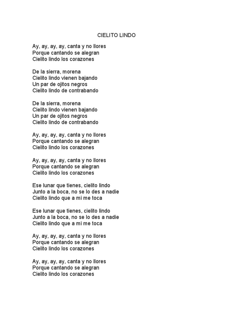 Cielito Lindo Con Letras - by el Albionauta CielitoLindo AlbionautaDe la sierra morenaCielito lindo vienen bajandoUn par de ojitos negrosCielito lindo d. Cielito ist die Koseform des Wortes cielo Himmel. Ay ay ay ay canta y no llores porque cantando se alegran los corazones.